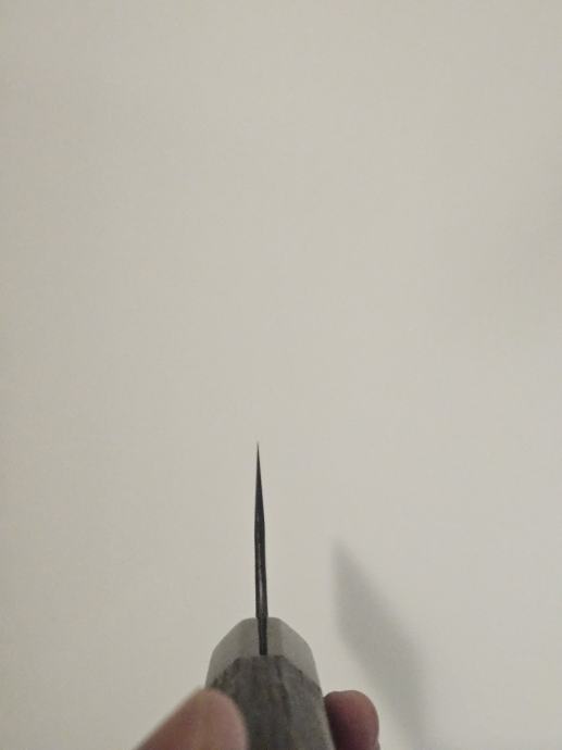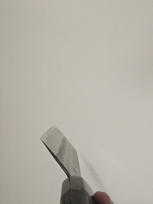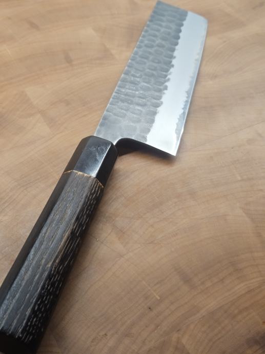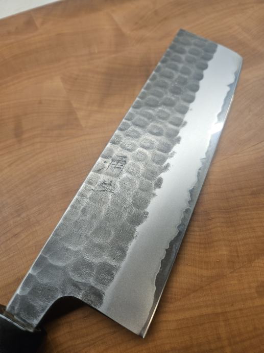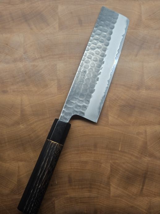 Korišten par puta, gotovo bez tragova korištenja. Shirogami (White) #2 karbonski čelik, inox (stainless) obloga, polirana leđna strana (spine) i zaobljeni choil. Kurouchi + tsuchime završna obrada. Drška je osmerokutna od paljenog kestena s horn (rožnatim) završetkom, tretirana i zapečaćena.