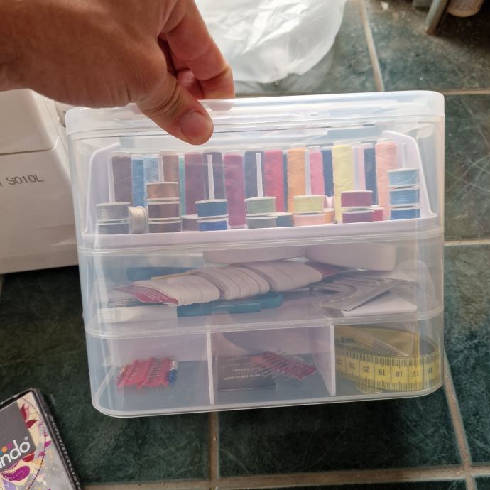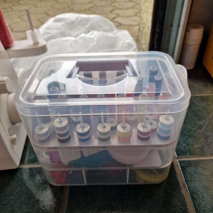 Prodaje se komplet sa priborom za šivanje koji se nalazi u kutiji.