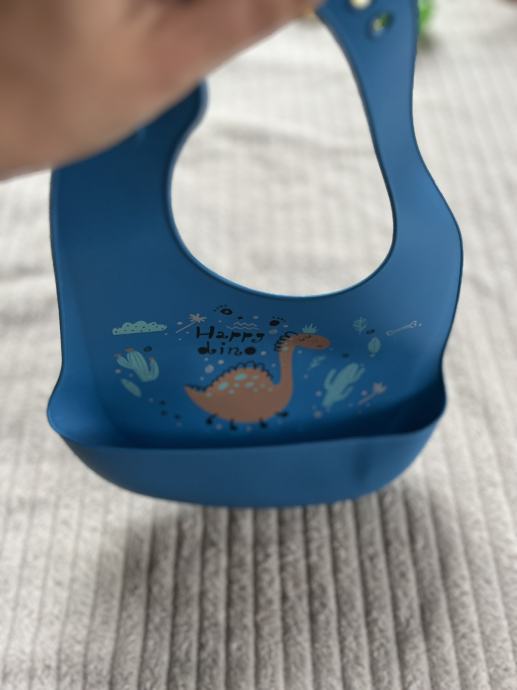 Plavi silikonski podbradnik dinosaur, BPA Free. Vodootporan, može se podešavati oko vrata. Samo opran.