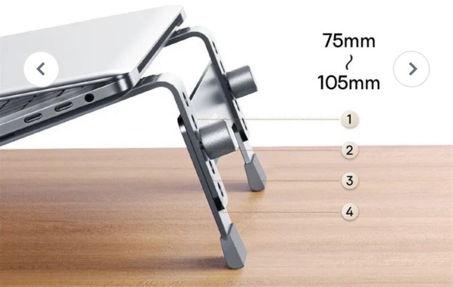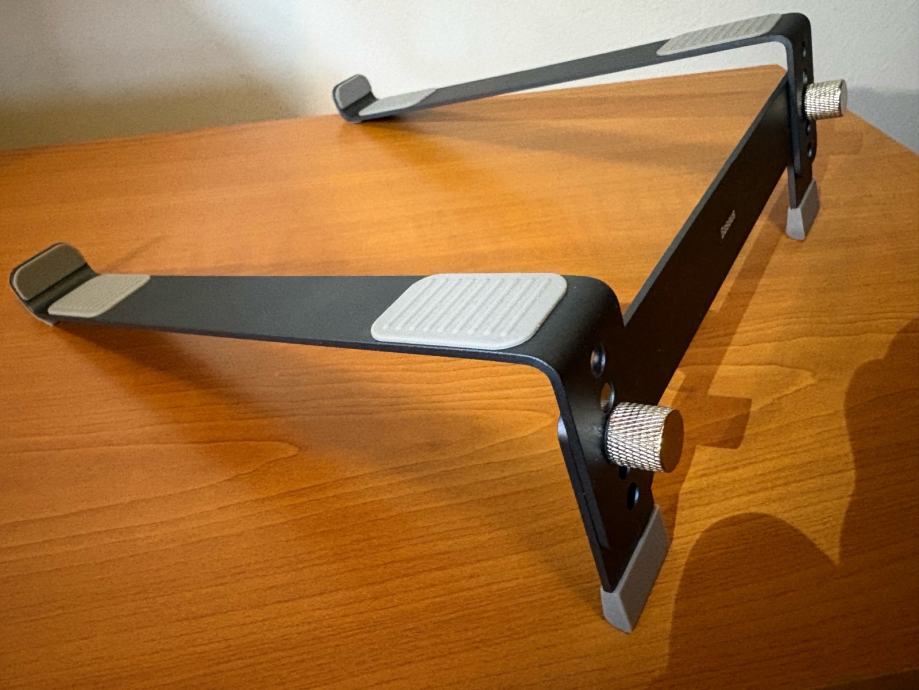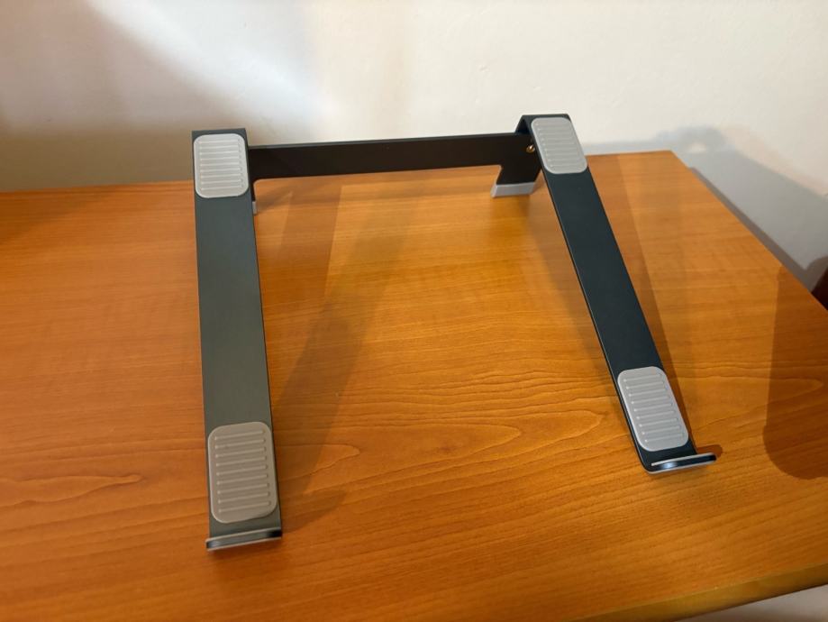 kvalitetan aluminijski stalak za laptop, podesiv po nagibu sa 4 stupnja podešavanja visine od 75 do 105 mm, odgovara za laptope veličine 13’’ do 17’’, vrlo izdržljiv (max 20 kg), sa gumenim zaštitama od pomicanja laptopa i samog stalka na stolu, može se jednostavno rastaviti tako da se prenosi u torbi, idealan za stolnu upotrebu, nov nekorišten, 15€, moguće slanje (+2€) ili dostava do Zagreba