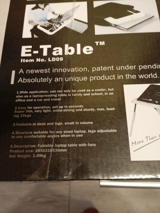 Prodajem potpuno novi stolić za laptop s integriranim ventilatorima za hlađenje. Praktičan i funkcionalan stalak s podesivom visinom i kutom, idealan za rad na prijenosnom računalu u krevetu ili na kauču. Sklopiv je i lagan, što ga čini savršenim za korištenje kod kuće ili tijekom putovanja.