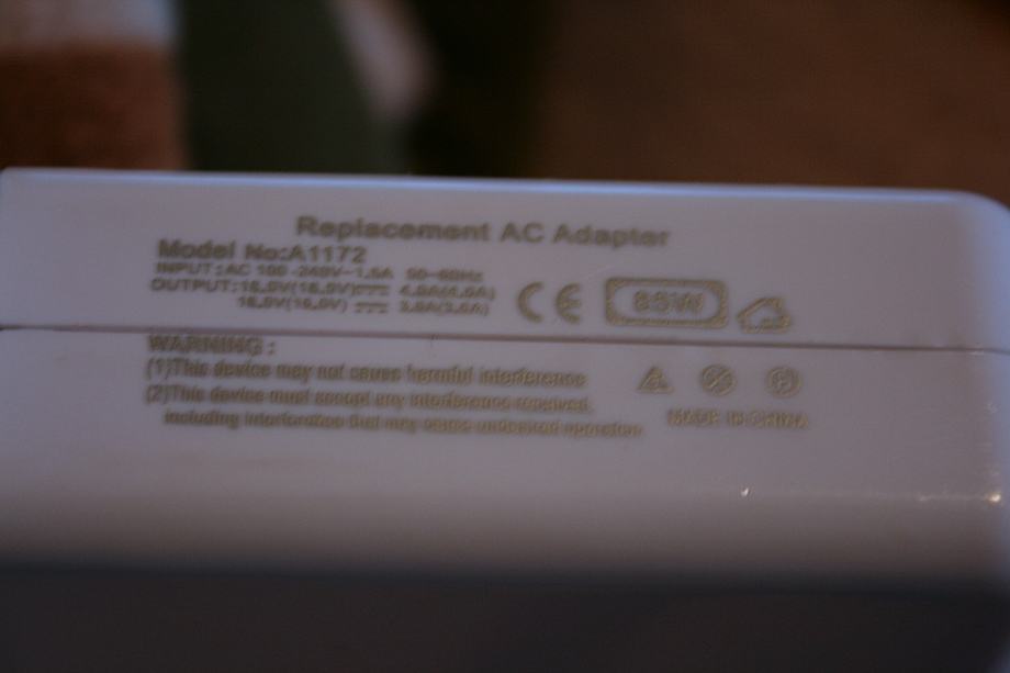 Prodajem zamjenski adapter za MacBook Pro, nije originalni, no izvrsno služi svojoj svrsi. Kupljen u Švedskoj, korišten nekoliko mjeseci, dok nisam nabavio originalni. Korišten na starom MBP 3,1 (15\" verzija sa 2.4GHz) i najnovijem 5,4 unibodyju (17\" verzija sa 2.8GHz) i radi odlično!