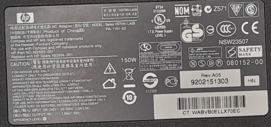 Prodajem originalni HP AC adapter snage 150 W za prijenosno računalo.