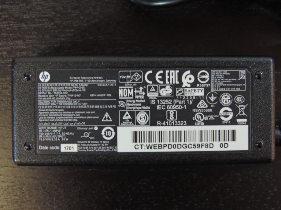 Na prodaju originalni i nekorišteni strujni adapter (punjač) za Laptop HP, maksimalno 65W, priključak SMART PIN 4.5mm, model PPP009C. Kompatibilan je sa svim HP prijenosnicima koji koriste tanki priključak sa smart pinom. Kompatibilan je sa nižim snagama (30W / 45W) te može zamijeniti bilo koji Vaš manje snažan punjač. Ne posjeduje originalnu ambalažu pa može posjedovati lagane tragove skladištenja.