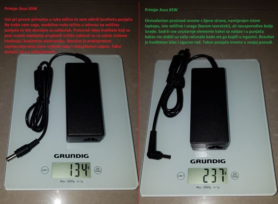 U ponudi originalni i vrhunski zamjenski punjači provjerenih proizvođača (Akyga, Patona, Green Cell) za sve vrste laptopa - HP, Asus, Acer, Sony, Samsung, IBM, Lenovo, Toshiba, Dell, Fujitsu, Apple (Macbook), Bixolon, Epson. Punjači su namijenjeni našem tržištu - EU utičnica i napon 220V.