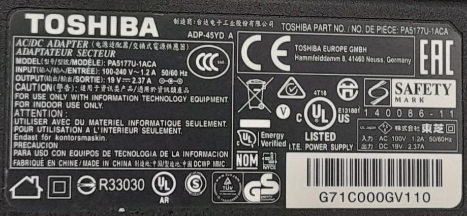 Kompatibilan s mnogim Toshiba laptopima (Satellite, Tecra, Portege i dr.) koji koriste 19 V / 2.37 A adapter.