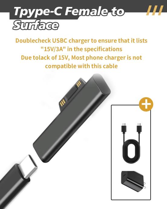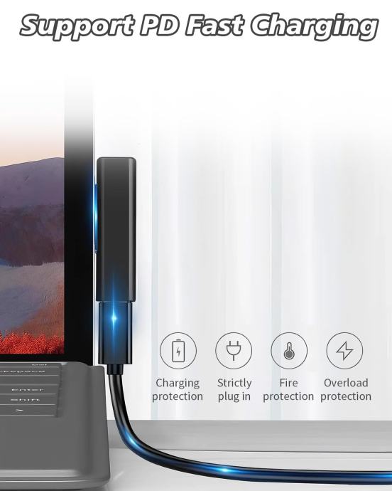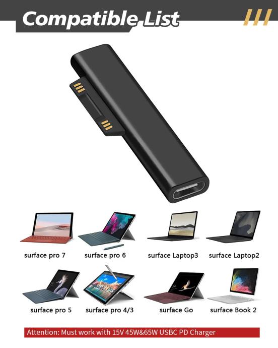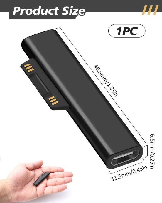 Kompatibilan s Microsoft Surface uređajima: Pro 9/8/7/6/5/4/3/X, Laptop 5/4/3, Go 3, Book i Surface priborom. Pretvara bilo koji USB-C PD izvor u Surface punjač.