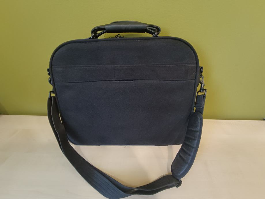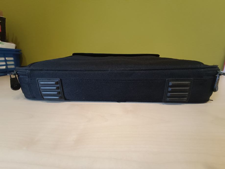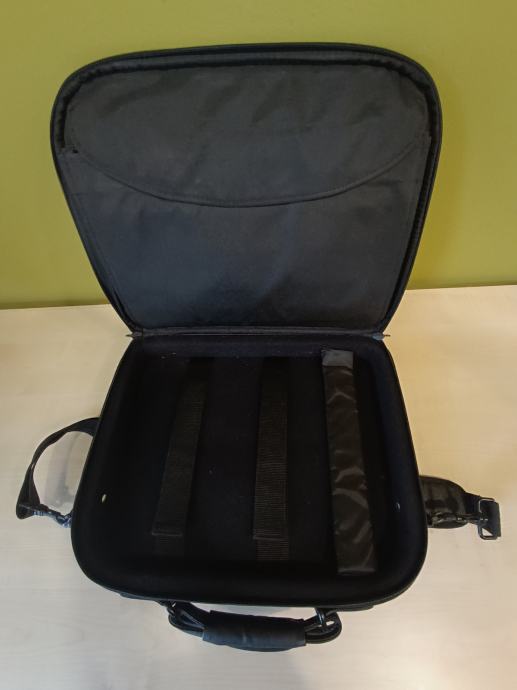 Očuvana, tvrda torba za laptop s remenom kojem se može prilagoditi dužina, kratkom ručkom i puno pretinaca. U odličnom stanju.