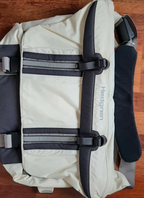Hedgren torba za razne namjene, pretinac za kompjuter/laptop, nikad korištena, boja prljavo bijela, podesivi remeni, praktični džepovi i pretinci, velik glavni pretinac s odvojenim podstavljenim džepom za laptop