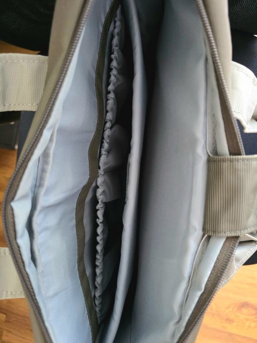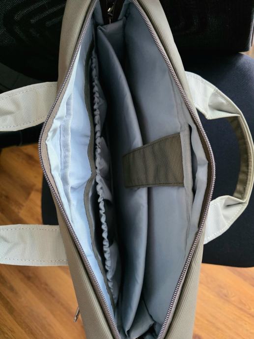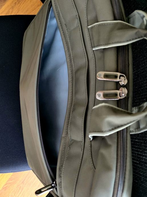 - glavni pretinac se sastoji od 3 dijela: odjeljak za laptop sa sigurnosnom trakom na čičak koja drži laptop na mjestu, srednji prostor te dodatne 2 pregrade s rastezljivom gumom na otvoru za punjač, miš i sl.
