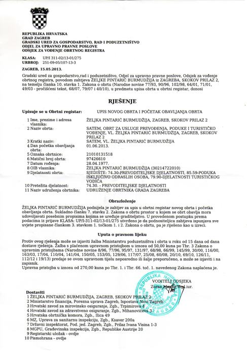Satem, obrt za usluge prevođenje, poduke i turističko vođenje, vl. Željka Pintarić Burmudžija, mag. eng. i rus.