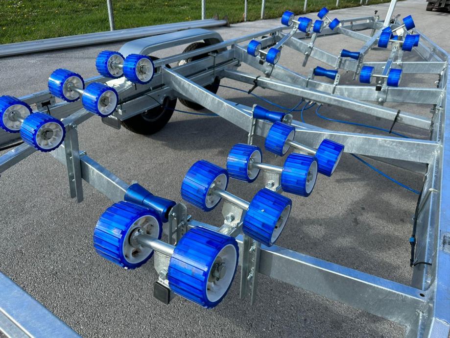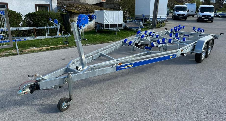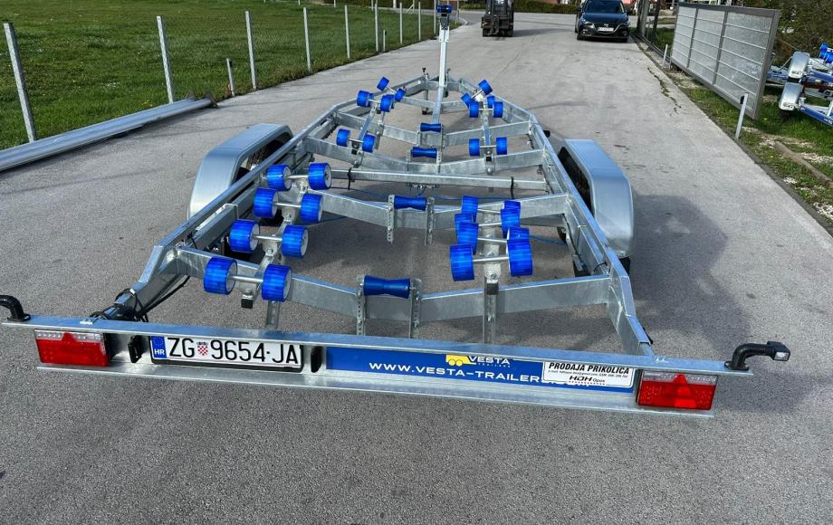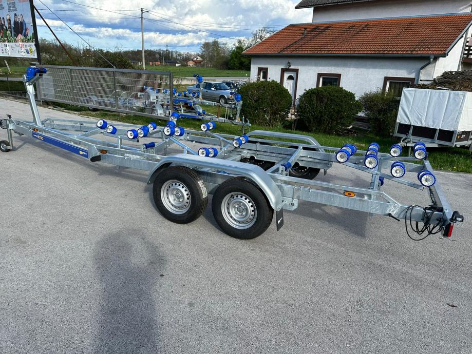 Prikolica je tvornicke izrade visoke kvalitete vruce cincane šasije te opremljena orginalnim djelovima Njemackog proizvođača Knott, vrlo prilagodljiva duzini broda sto omogucava vrlo lagan utovar broda iz vode pomocu Knott vitla te dodatnih koluturnka koji se prilagodavaju svakoj brodici gumenoj ili plasticnoj te siguran i jednostavan transport po cesti svim vrstama vozila. Visoka kvaliteta izrade, sigurnost u prometu, osigurani svi rezervni djelovi, garancija od jedne godine su razlog da odaberete ovu prikolicu za Vasu brodicu. Prodaje se sa svom opremom kao na slici.