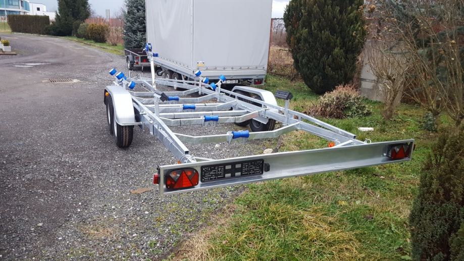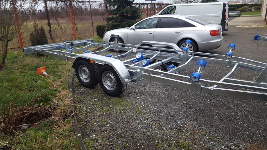 Širina: Na osloncima 1800 mm Nosivost: 2500 - 3500 kg Podesiva po visini na bočnim i doljnjim osloncima. Podesiv oslonac pramca. Skidajuća rasvjeta. Potporni kotač. Naletni kočioni sustav. Težina ovisi o dužini i izvedbi prikolice, a kreće se od 350 - 450 kg.