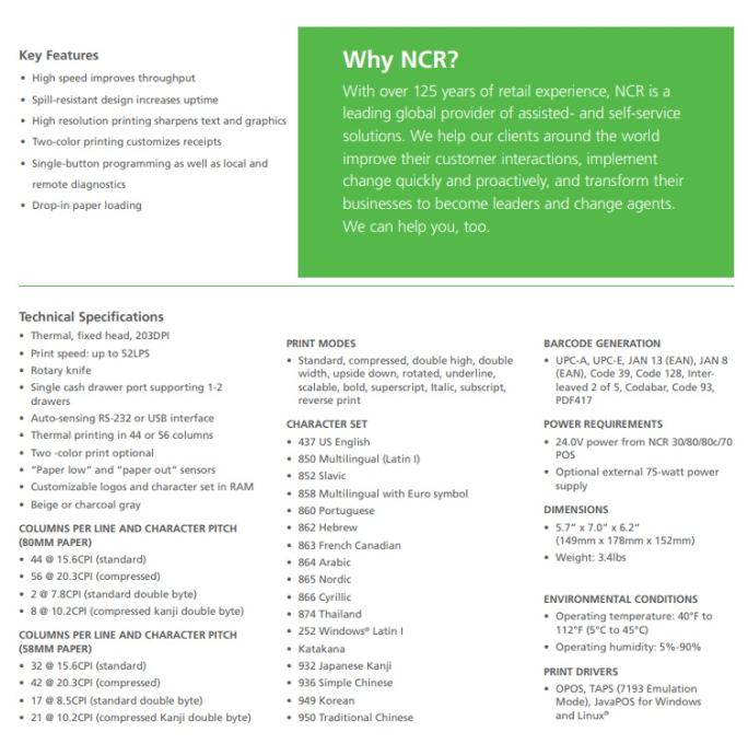 NCR RealPOS 7197 pruža iznimne performanse ispisa velikom brzinom. Ispis visoke razlučivosti u kombinaciji s ispisom u dvije boje pretvara se u oštar tekst i oštru grafiku za čišći ispis koji se lako čita. NCR RealPOS 7197 nudi mali otisak i visoke performanse kako bi zadovoljio potrebe svakog maloprodajnog okruženja, posebno zahtjevne ugostiteljske industrije.