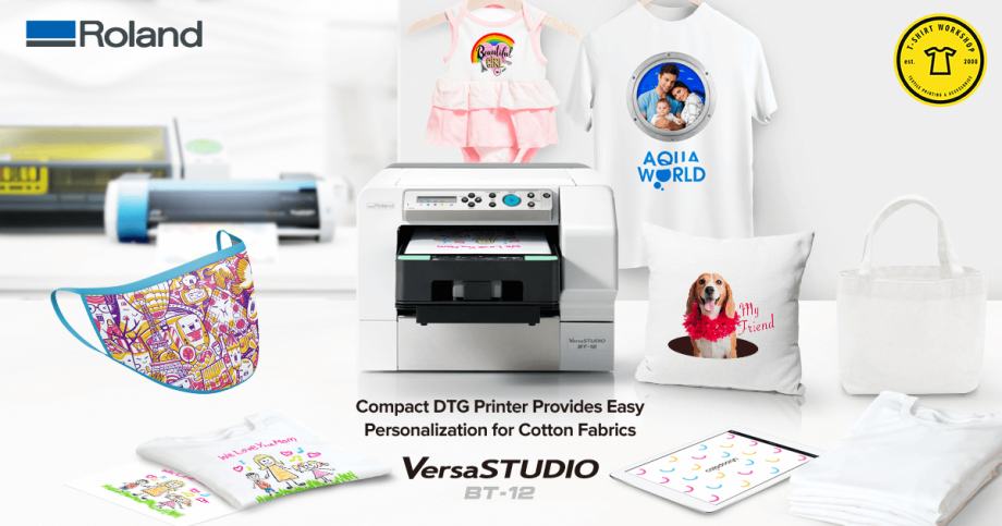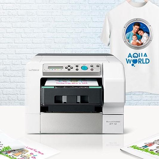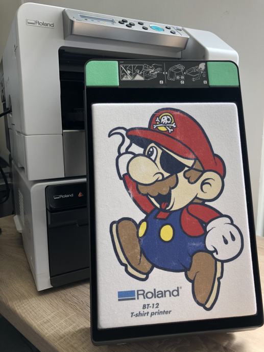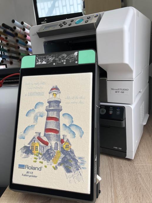 Roland VersaStudio BT-12 – Demo printer sa lagera. Vrlo jednostavna priča sa tiskom na majice predstavljena je prošle godine na sajmu Sign Expo i FESPA Berlin pod imenom Roland VersaStudio BT-12. Roland VersaStudio BT-12 je nova generacija malog desktop DTG printera za majice i razne druge tekstilne materijale. Ovaj printer koristi isključivo CMYK sistem za tisak na tekstil i u sebi nema bijelu boju kao opciju koja se koristi kod apliciranja na tamne majice. Roland BT-12 DTG printer je vrlo jednostavna opcija malog desktop printera koji može otisnuti dizajn u A4 i A5 formatu, a svoju primjenu pronašao je najčešće za tisak malih personaliziranih naklada tipa fotografija ili poklona.
