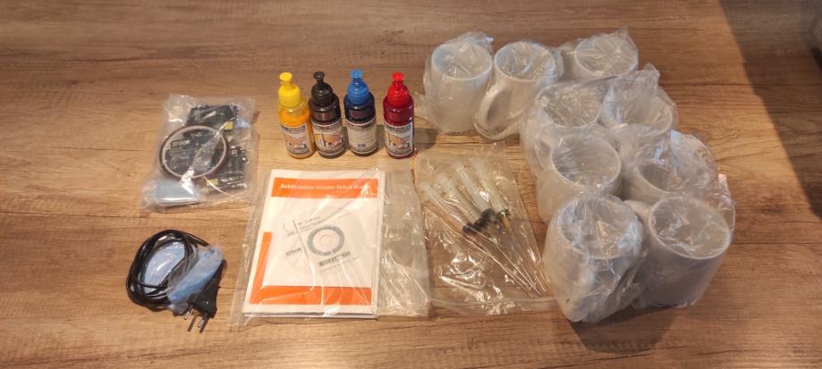 Prodajem Sublimacijski printer Epson WF-2010, u kompletu s dopunjivim tonerima (ulošci, boje, set za dopunjavanje), sublimacijskim papirima (cca 140 kom), šalice za sublimaciju (5kom)