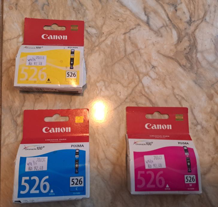 Tinte u boji za printer Canon 526, 3 kom po 10 eura, može i kupnja na komad.