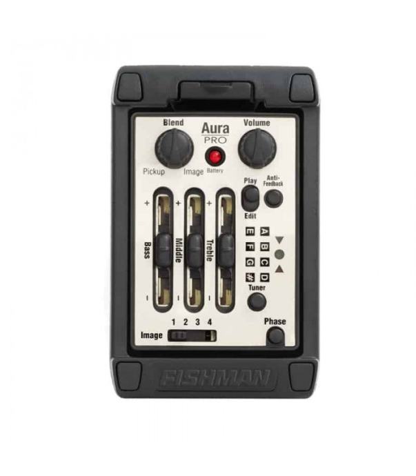 Fishman Aura Pro Onboard Preamp. Kataloški model: PRO-MAN-P81. Graditelji gitara tražili su Aura sistem koji bi se mogao ugrađivati u njihove akustično-električne gitare. Fishman Auro Pro sada je dostupan svima, a ne samo graditeljima gitara. Još neke karakteristike Fishman Aura Pro Onboard Preampa su: Pickup/Image blend, Volume, Bass, Middle i Treble kontrole, Feedback-fighting phase kontrola, digital kromatski tuner, a baterija traje do 27 sati.