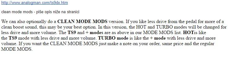 Napravljen je Clean Mod pa pedala sve u svemu ima nešto manje Gaina, više Volumena i kompletan Gain je fokusiraniji, topliji, ne raspada se i manje boja osnovni zvuk pojačala već dodaje puno ljepše frekvencije u mix... (više u jednoj od slika ili na stranici Analogmana).