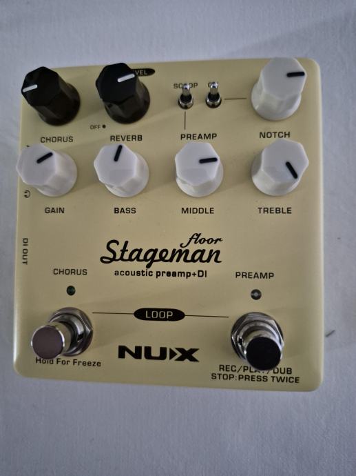 NUX floor stageman acoustic prempl+ Di ,je analogno akustično predpojačalo sa digitalnim efektima i funkcijom loopera koji snima 60 sekundi sa neograničenim overdubovima .