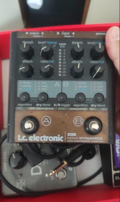 TC Electronic Nova Dynamic - koristena pedala , birate studio ili pedal kompresor ili noise gate. Dva footswitcha tako da mozete namjestiti jednu stranu za strata sa singl coilsima a drugu za gitaru s humbuckerima ili ako koristite zestike distorzije podesite nosie gate. Gitara nema suma , idealna za snimanje. Napajanje radi sa 9 i s 12 v. U Hrvatskoj sam od 8. do 15.3. Saljem postom, preko Tiska ili osobno preuzimanje u Puli. Prolazim kroz Zagreb 9.3. i opet 16.3. kad imam let za Irsku. Poruke na whatsapp: plus tri 5 tri 1 nula sedam 44 dva devet. Roberto