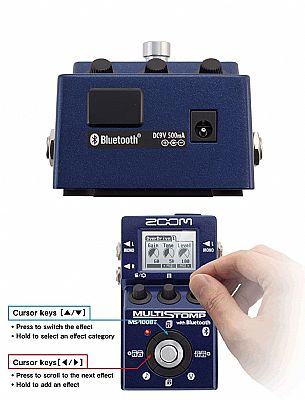 Powerful, easy-to-use stompbox multi-effect guitar pedal that is loaded with 100 of the world’s most popular effects and amp models, and also the first effect pedal to incorporate Bluetooth technology, the ultimate high-speed wireless solution for sending and receiving data from and to iPhone, iPad or iPod Touch. It allows using the pedal with Zoom’s StompShare app, a virtual effects shop available from the Apple App Store for free download. Bluetooth connectivity also enables quick and easy update of the firmware. Pedal offers 100 effects, including distortion, amp models, modulation, delay, and reverb - up to 6 effects can be used simultaneously in any order. It provides 50 memory locations for the storage of user-created patches and 30 preset patches, and allows for patch cycling. On-board chromatic tuner supports all standard guitar and bass tunings, including open and drop tunings. Pedal also features a Tap tempo function and an Auto Save function for automatic saving of all patch parameters. It provides dual 1/4" input jacks (both active and passive instruments supported), dual 1/4" output jacks and a backlit LCD with contrast control for easy viewing in low-light environments. It runs on 2 AA batteries (included), with alkaline battery life of 5 - 7 hours, or an optional AC adapter. Dimensions: 130.3 x 77.5 x 58.5 mm. Weight: 360 g.