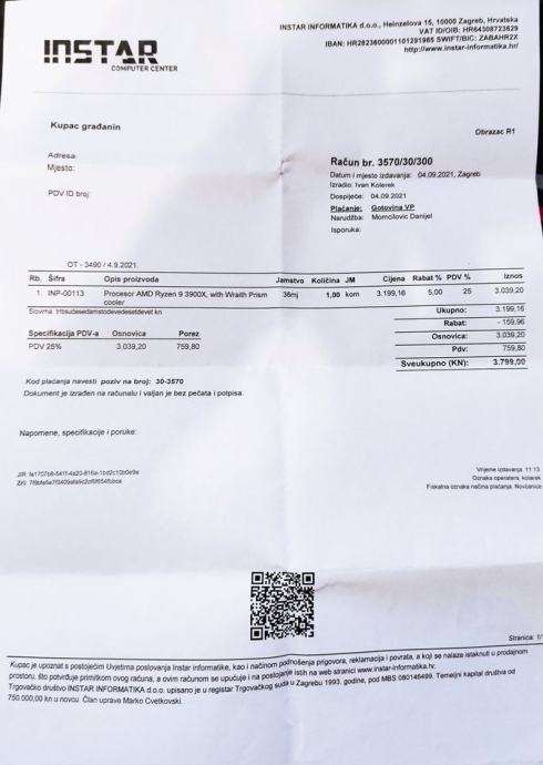 + AMD Ryzen 9 3900x= placen 3998,95hrk u Instar Informatika sa racunom, garancijom i kutijom.