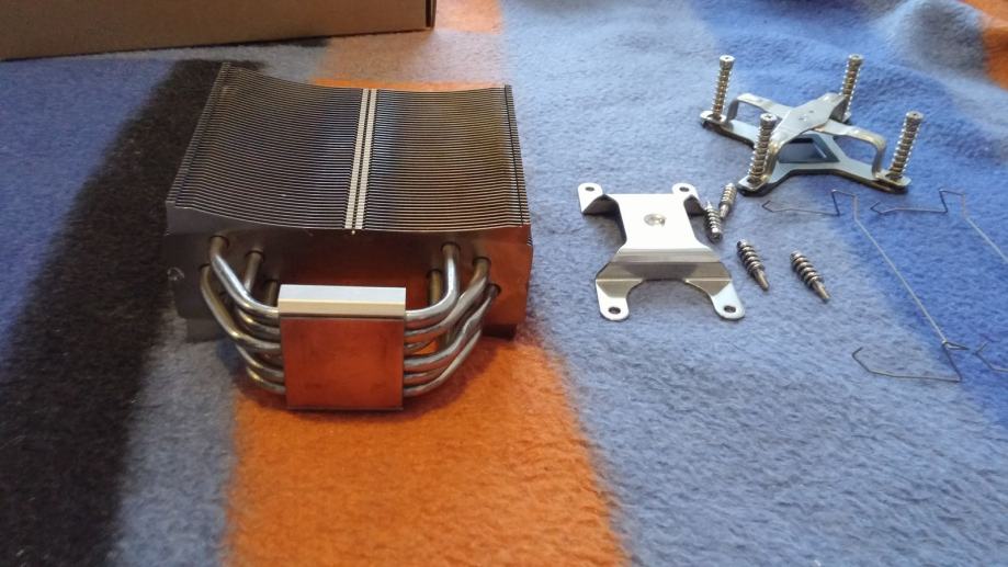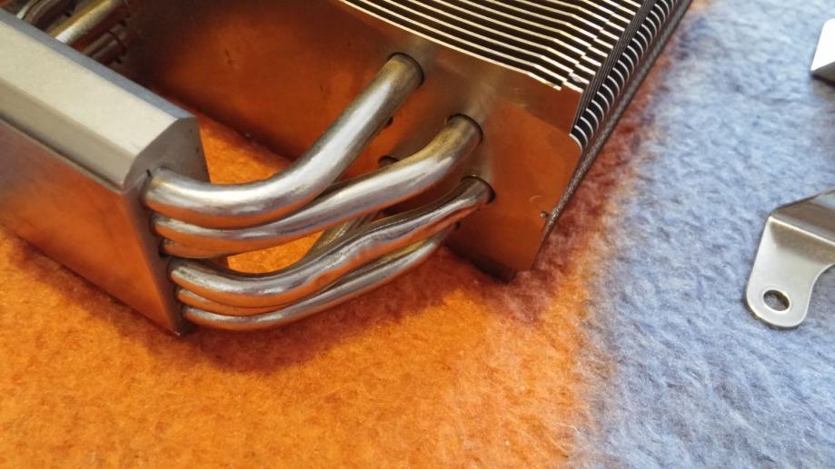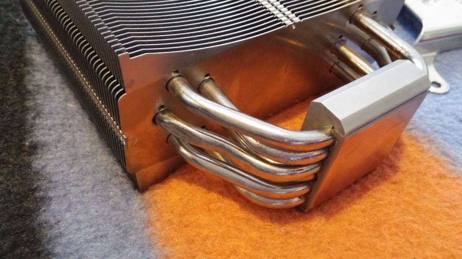 Ravnata je baza hladnjaka (nije se išlo na mirror finiš, samo ravnanje), sada izgleda malo "grubo" jer sam jedno vrijeme koristio Collaboratory Liquid Metal Pad, kojeg je poslije bilo teže skinuti. Jedan heatpipe je namjerno malo udubljen / iskrivljen jer mi je smetao za hladnjak RAM-a - nema nikakvog utjecaja na rad hladnjaka.