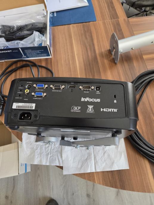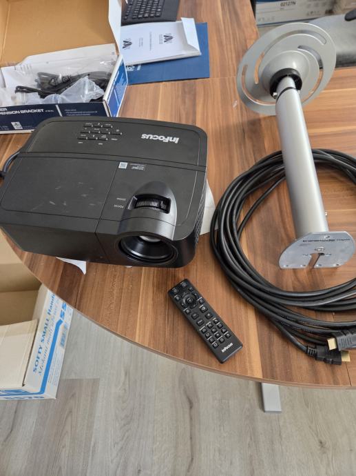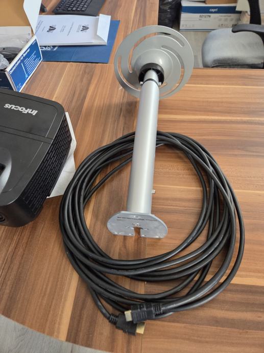 Dolazi sa stropnim nosacem bas za taj model- vidi sliku, sa 8 m Hdmi kabelom i Vga kabelom