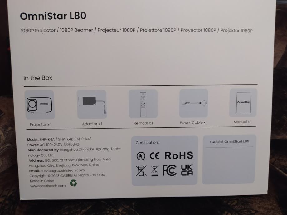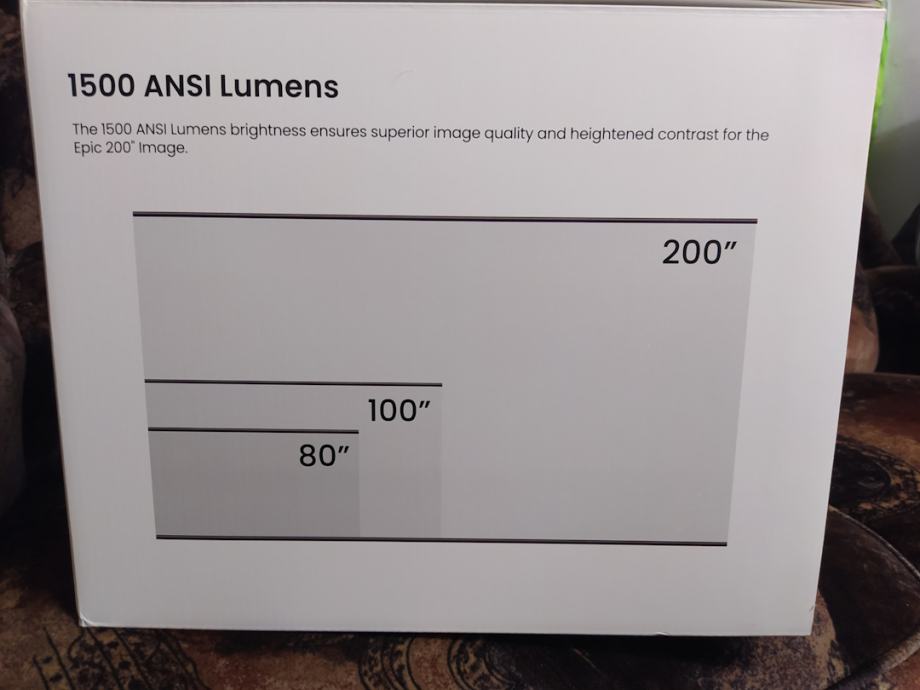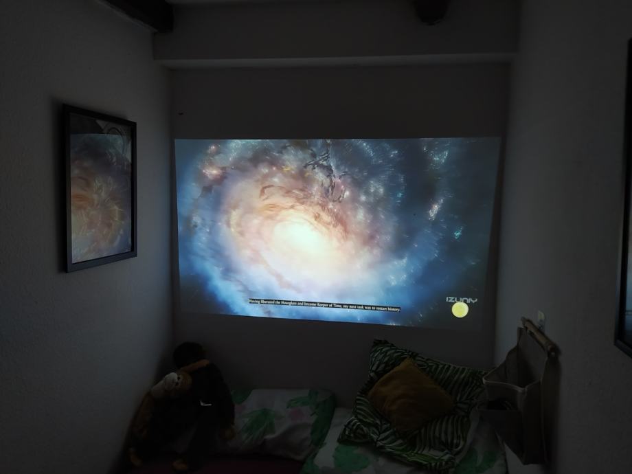 U principu novi, jedva koristeni LCD projektor. Dopusta samostalni rad, ima wifi/ethernet, ili preko USB-a i HDMI-a. Rezolucija 1080p te projekcija do 200 incha. U projektoru su ugradeni glasni zvucnici (30w), i moze ga se isto koristiti ekskluzivno samo kao zvucnik ako se to pozeli za pustati muziku preko mobitela. Dolazi sa dalijnskim, ali se na njega mogu dodati i druge periferije preko bluetooth-a. Zasticen od prasine, ima IP5X.