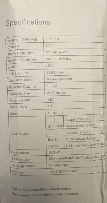 Projektor ima ugrađenu bateriju od 1500mAh te podržava napajanje preko adaptera (12V-2A) ili mobilnog punjača (5V-2A). Potrošnja je 10-30W. Podržava ulaze HDMI, USB i micro SD kartice te reproducira različite multimedijske formate (glazba, fotografije, video). Sistemski podržava više jezika.