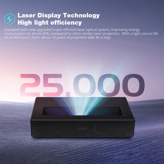 Tehnologija: Ultra short throw 3-Laser sustav (630 ANSI lumena, životni vijek 25.000 sati)