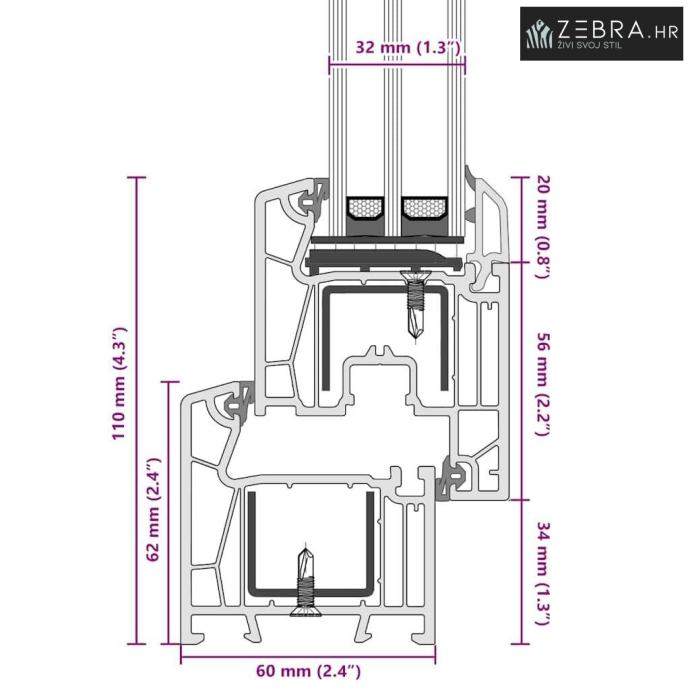 Stabilna struktura: Okvir ima dubinu od 60 mm i temelji se na 5-komornom sustavu s čeličnom jezgrom u obliku slova U iznutra za veću stabilnost.