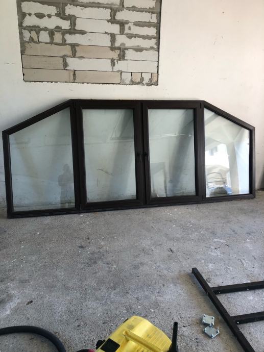 Prozor PVC dimenzija 1900 mm sirine i 1510 mm visine koji se odnosi na dio bez kosina sa svake strane. Sirina sa staklenim kosinama sa strane je ukupno 3630 mm. Boja je tamno smedja. Dvostruko izo staklo. Navedeni prozor (staklena stijena) je na kuci bio 5 godina te je nedavno skinut radi rekonstrukcije kuce (nova toplinska fasada) i radi dimenzija vise ne odgovara te se prodaje. Mob 091/1978-102