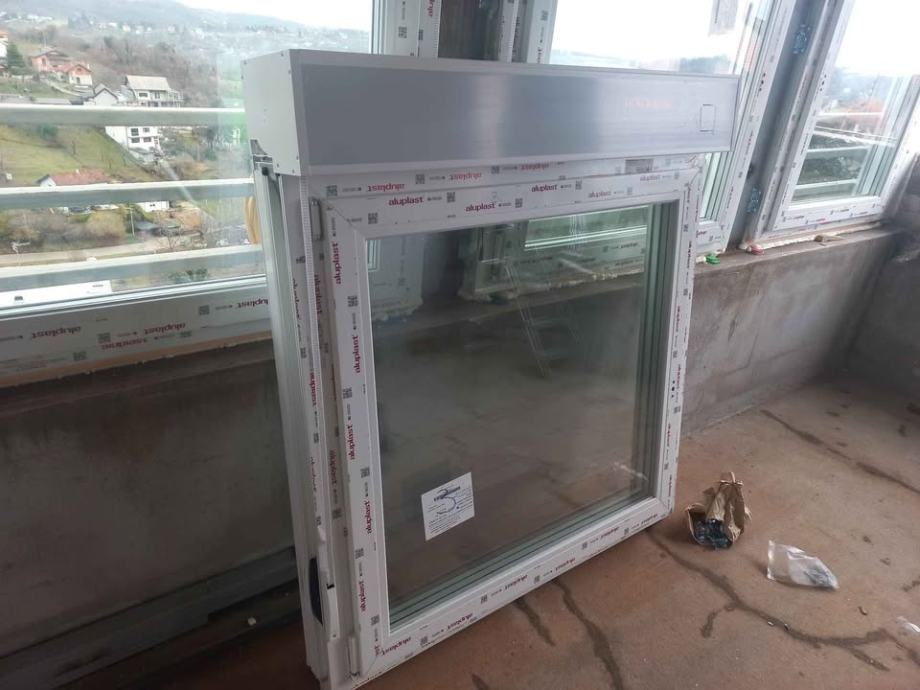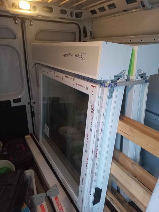 PVC prozor, troslojno staklo, rolo komarnik, alu roleta srebrna, 121x134cm visina sa kutijom i podštokom. Dva komada. Cijena po komadu 430 €.
