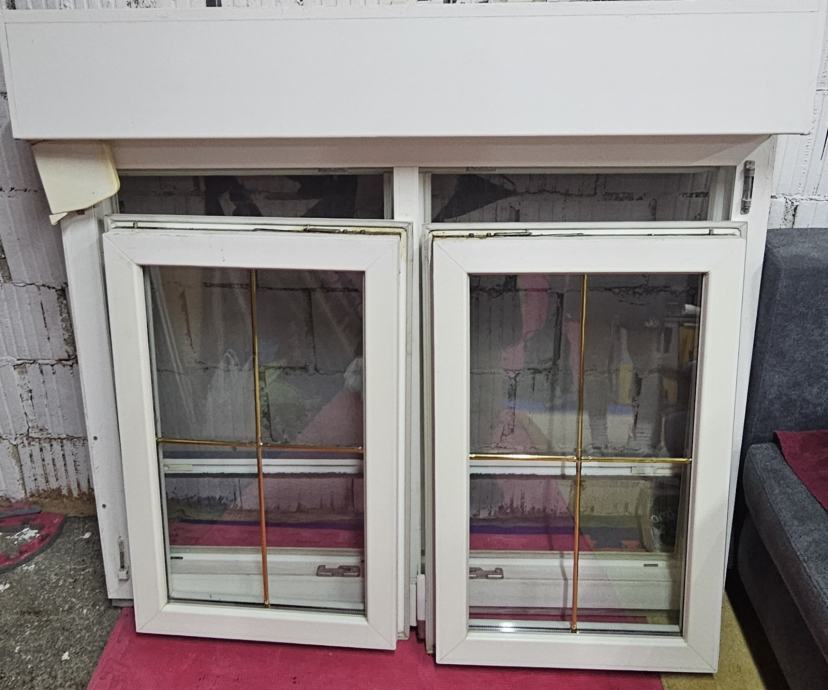 Prodajem dvokrilni PVC prozor vanjskih dimenzija 122×115 sa kutijom za rolete i rolo komarnikom, rolete su sive boje, krila su dimenzija 82×55,