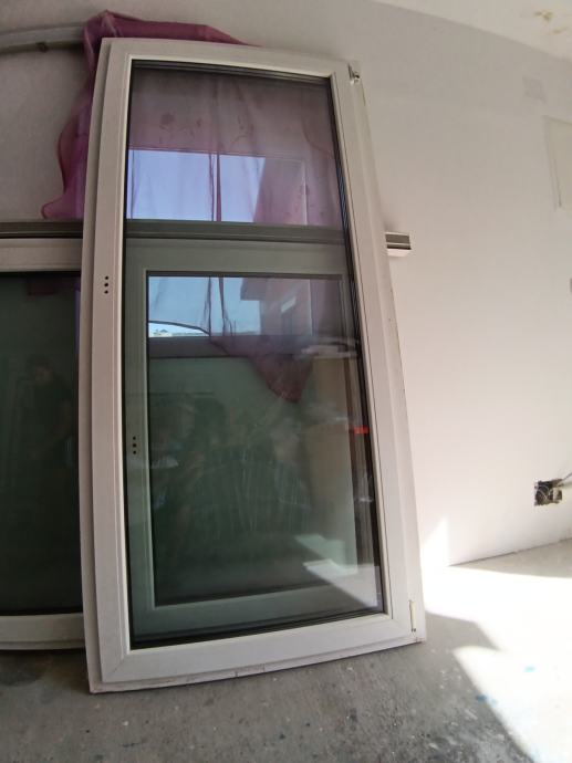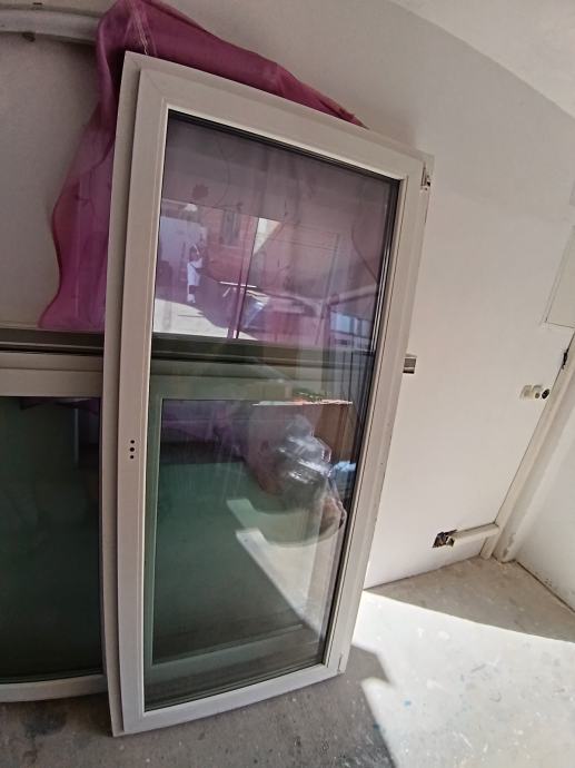 Pvc prozor za terasu ili balkon dim. 96x207 cm, staklo je duplo 4 cm debljine. Vanjski dio je smeđe boje dok je unutarnji dio bijele boje. Otvaranje na desnu stranu.