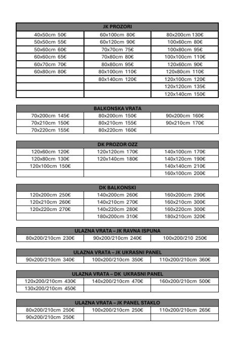 Dostupne sve standardne dimenzije prozora, balkonskih i ulaznih vrata