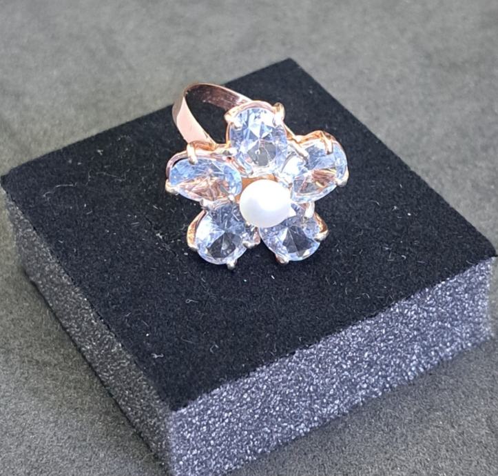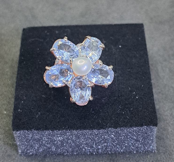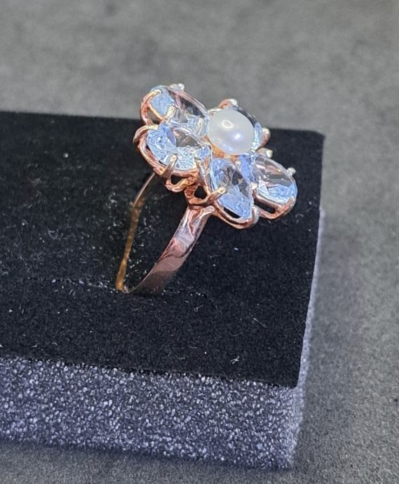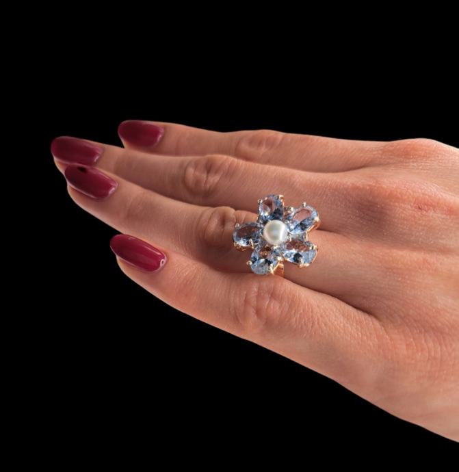 Prsten je rađen od Zlato 9kt te poludragim kamenjem akvamarin 12kt te biser(6x6mm) u sredini.