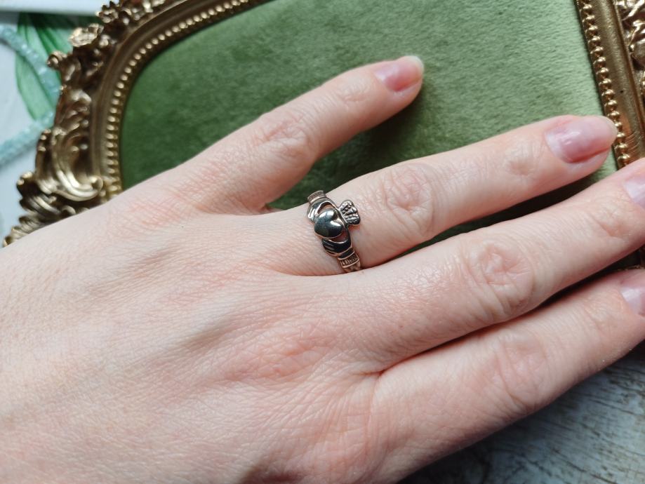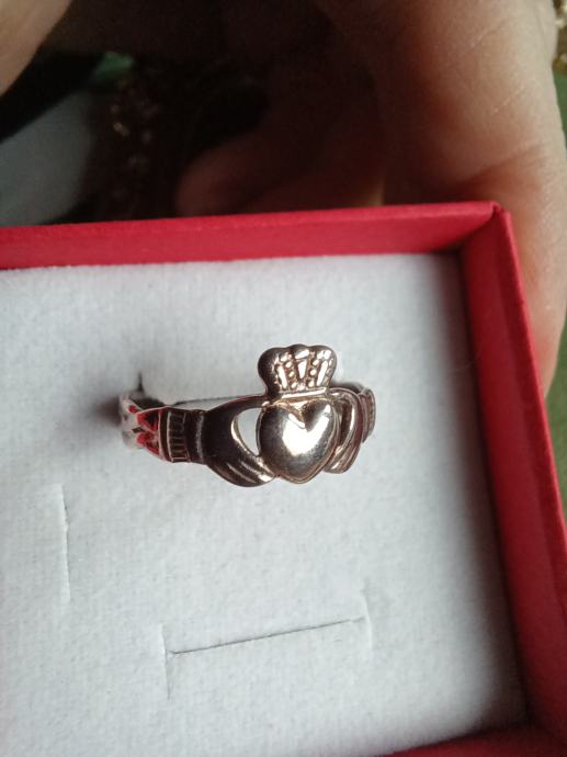 Claddagh vintage irski prsten, srebrni (nema oznaku, no provjeren kod zlatara), s pleterom. Veličine 18mm. Kupljen na sajmu antikviteta i čuvan u kutiji za nakit. S moje strane nenošen.