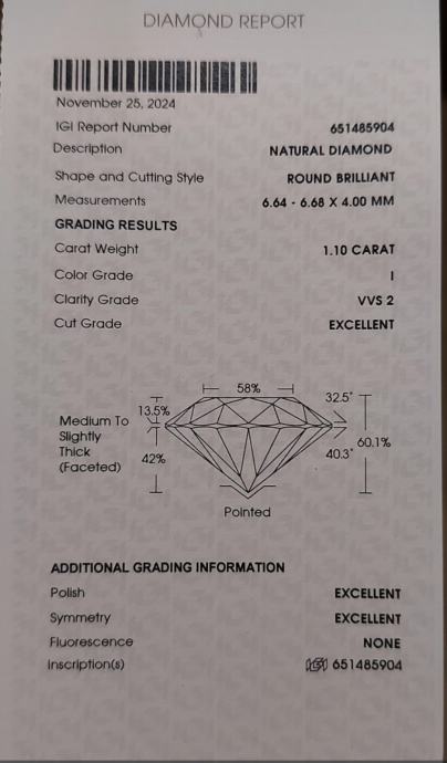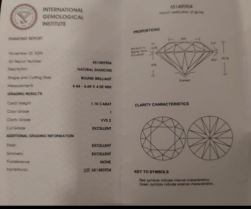 Dijamant prirodni,. svi podaci na cerificatu. 1.1 carat , itd .Slobodno provjerite cijenu za ovu velicinu i kvalitetu.