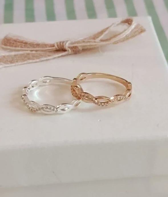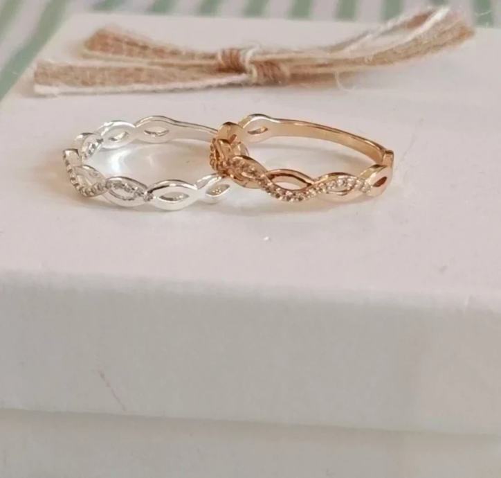 Isprepleteni i "twist" dizajn. Veličina zlatnog je 17,7 mm, a srebrnog 18,1 mm.