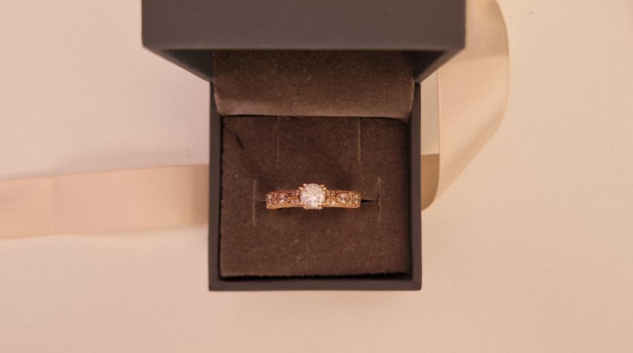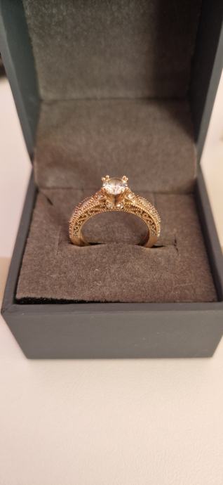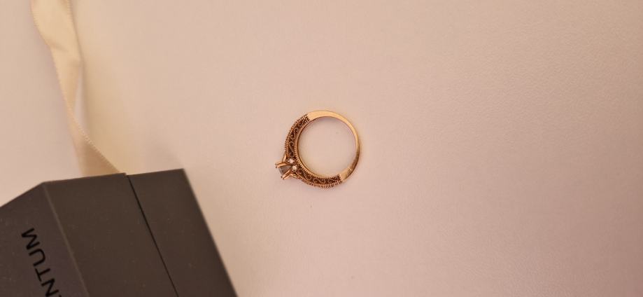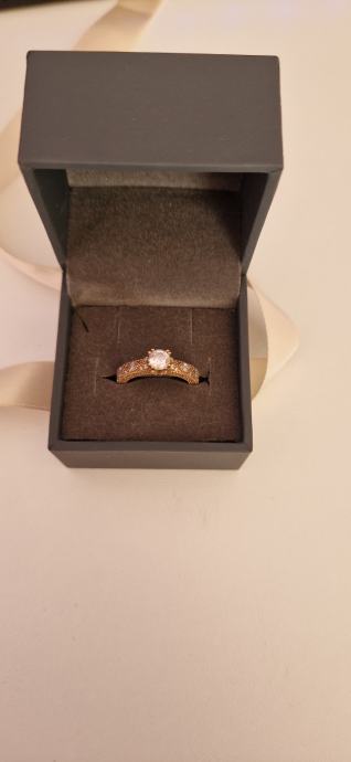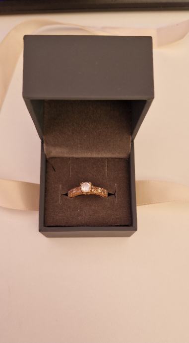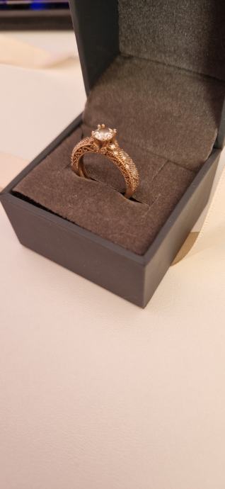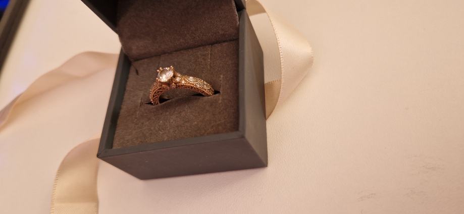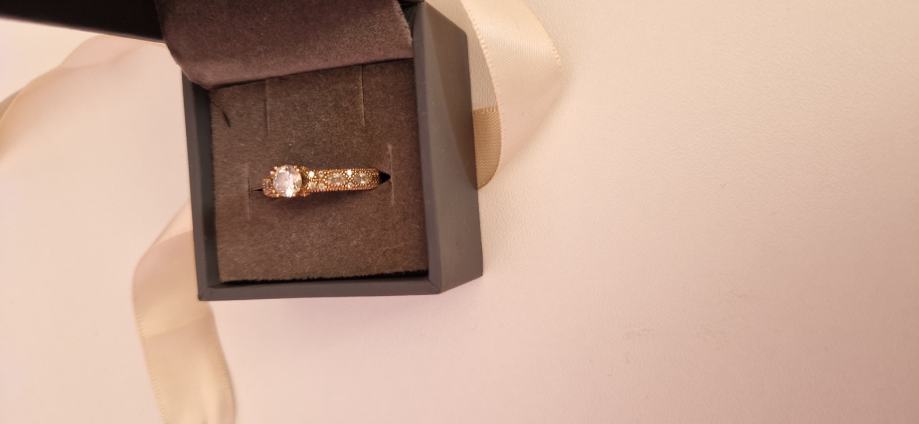 Prodaje se zaručnički prsten od ružićastog 14 karatnog zlata - 585/1000. Prsten je zapakiran u originalnu argentum kutijicu i vrećicu te dolazi uz potpisanu garanciju priloženu u oglasu. Dobro je očuvan i vrlo malo korišten i nošen (oko 1god).