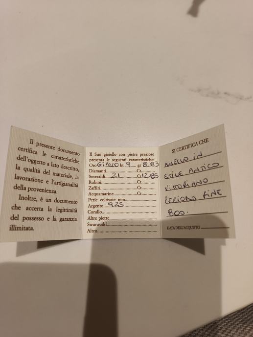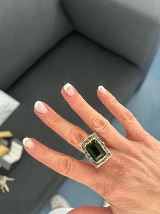 Prodajem elegantan prsten od zlata 9k i srebra, potpuno nov s etiketom. Prsten ima prekrasan dizajn s 21 smaragda ukupno 12.85 karata od kojih je centralni veliki smaragd od 12.5 karata. Kupljen u Italiji, dolazi s certifikatom.