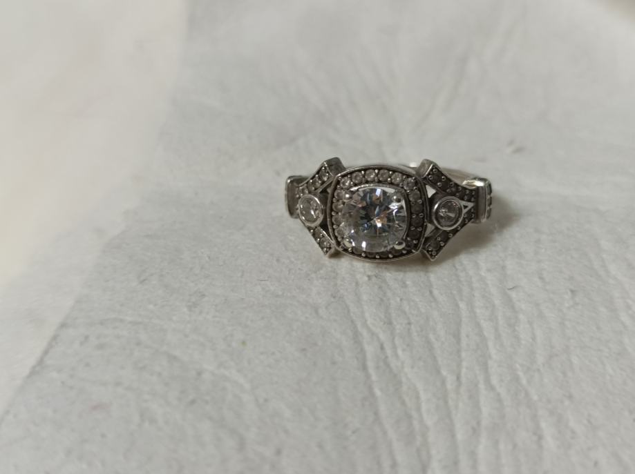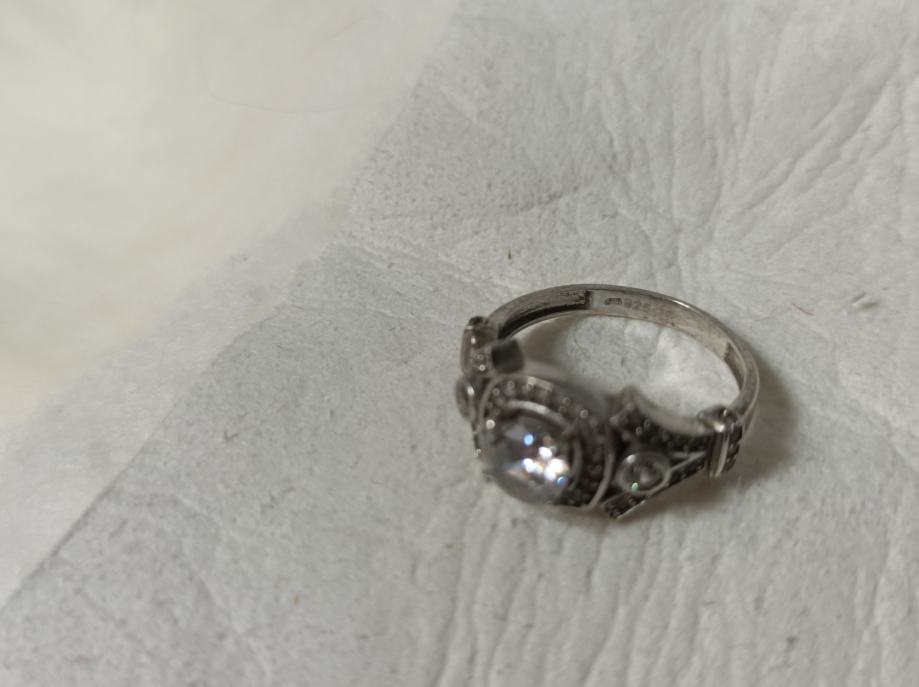 Srerbrni prsten promjera 17mm sa središnjim većim prozirnim kamenom, dva srednja, i puno malih