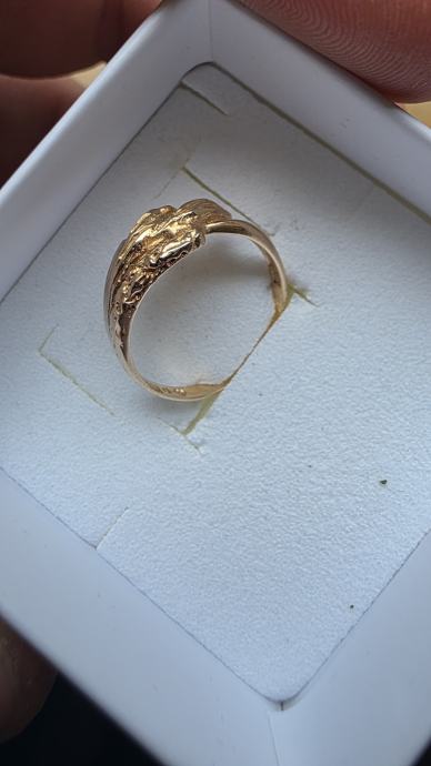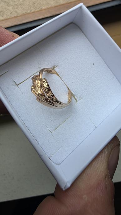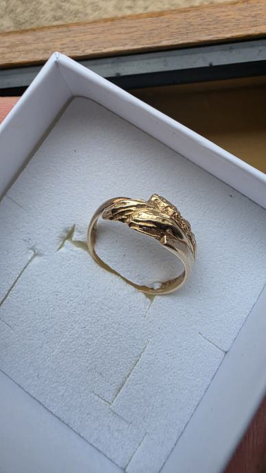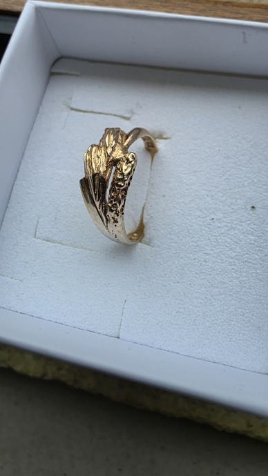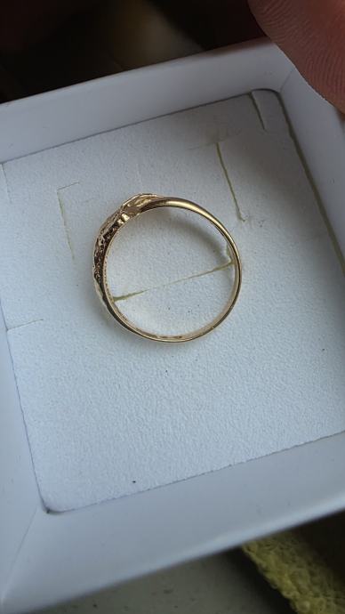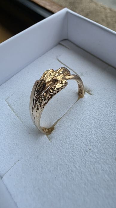 Prodajem zlatni prsten od 18 karata, težine 3,3 grama. Radi se o prstenu od žutog zlata s reljefnim ukrasom koji mu daje poseban, organski izgled. Prsten je nov, bez etikete.