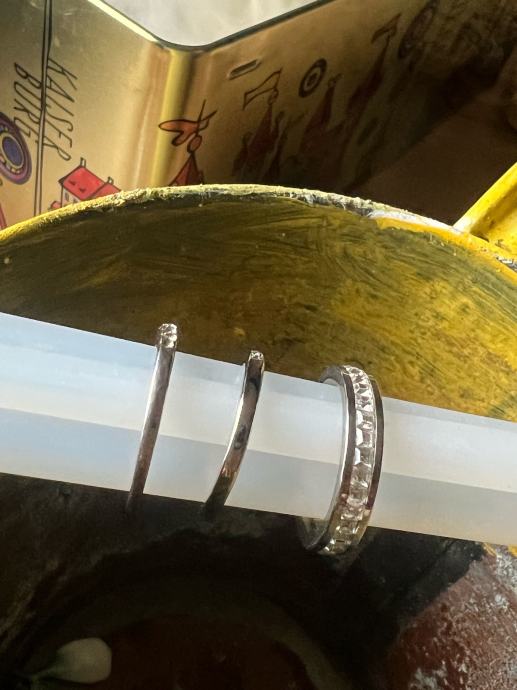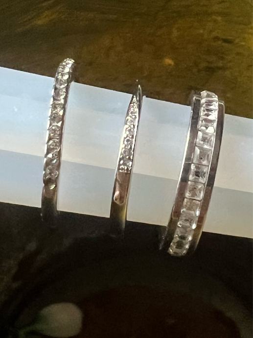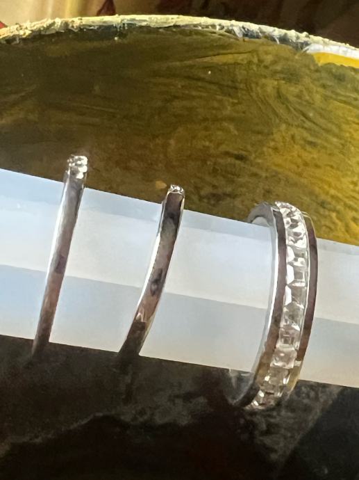 Prodajem set od 3 prstena od nehrđajućeg čelika u srebrnoj boji. Sva tri prstena su tankog, elegantnog dizajna s ukrašenom gornjom stranom koja izgleda kao da je posuta sitnim kamenčićima. Međusobno se razlikuju po širini i detalju ukrasa, što ih čini lijepim za slaganje više prstena na jedan prst ili nošenje posebno. Materijal je nehrđajući čelik, što znači da ne tamni i ne iritira kožu. Stanje je novo bez etikete.