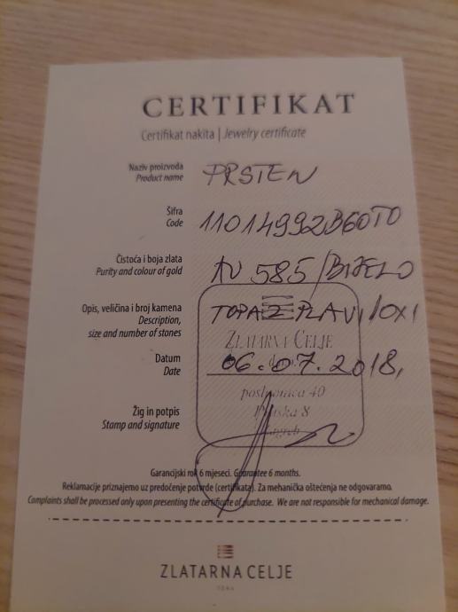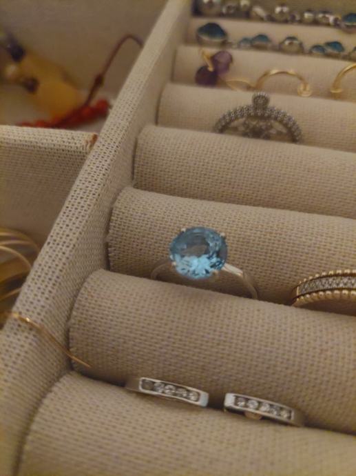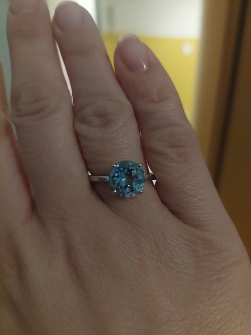 Prodaje se prsten od bijelog zlata s topazom (tirkizna boja), kupljen u zlatarni Celje.