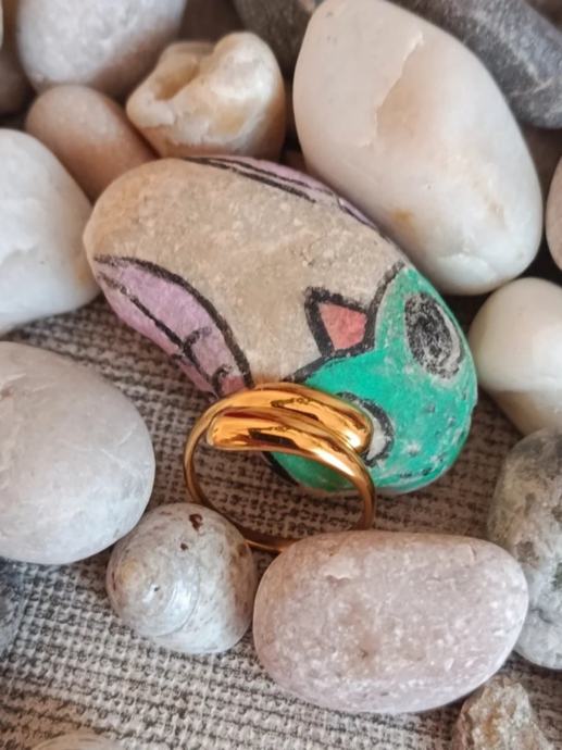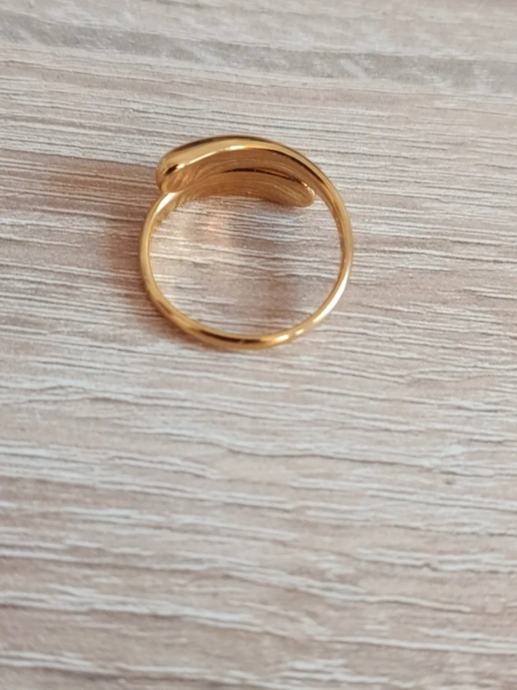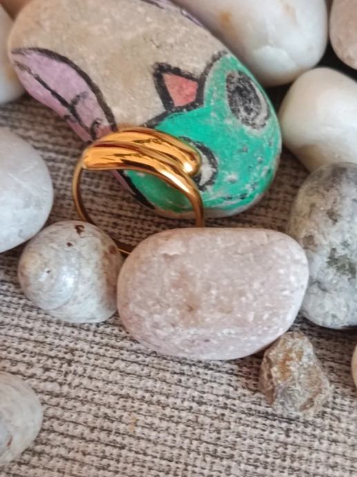 Novi prsten od nehrđajućeg čelika zlatne boje, gold plated. Ima preklapajuće, zaobljene elemente (skulpturalni ili valovitimć dizajn) tako da svojom elegancijom podsjeća na luksuzne modele od zlata.