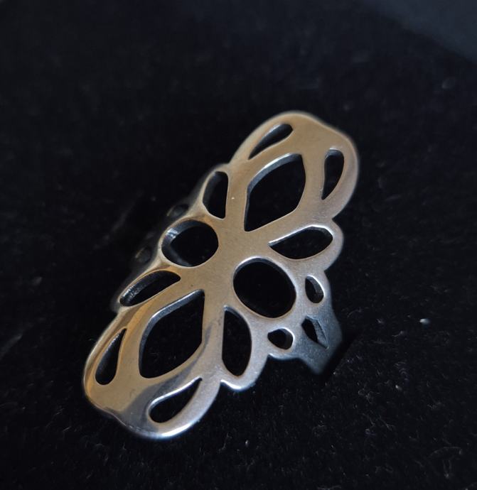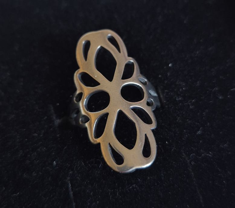 Prodajem novi prsten od nehrđajućeg čelika, promjera 19 mm. Radi se o izduženom prstenu s otvorenim cvjetnim uzorkom koji mu daje lagani i dekorativni izgled. Srebrnaste je boje, karakteristične za nehrđajući čelik. Dolazi s originalnom etiketom.